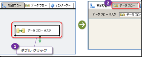 - 配置した[データ フロー タスク]をダブル クリックして、[データ フロー]タブを表示します。